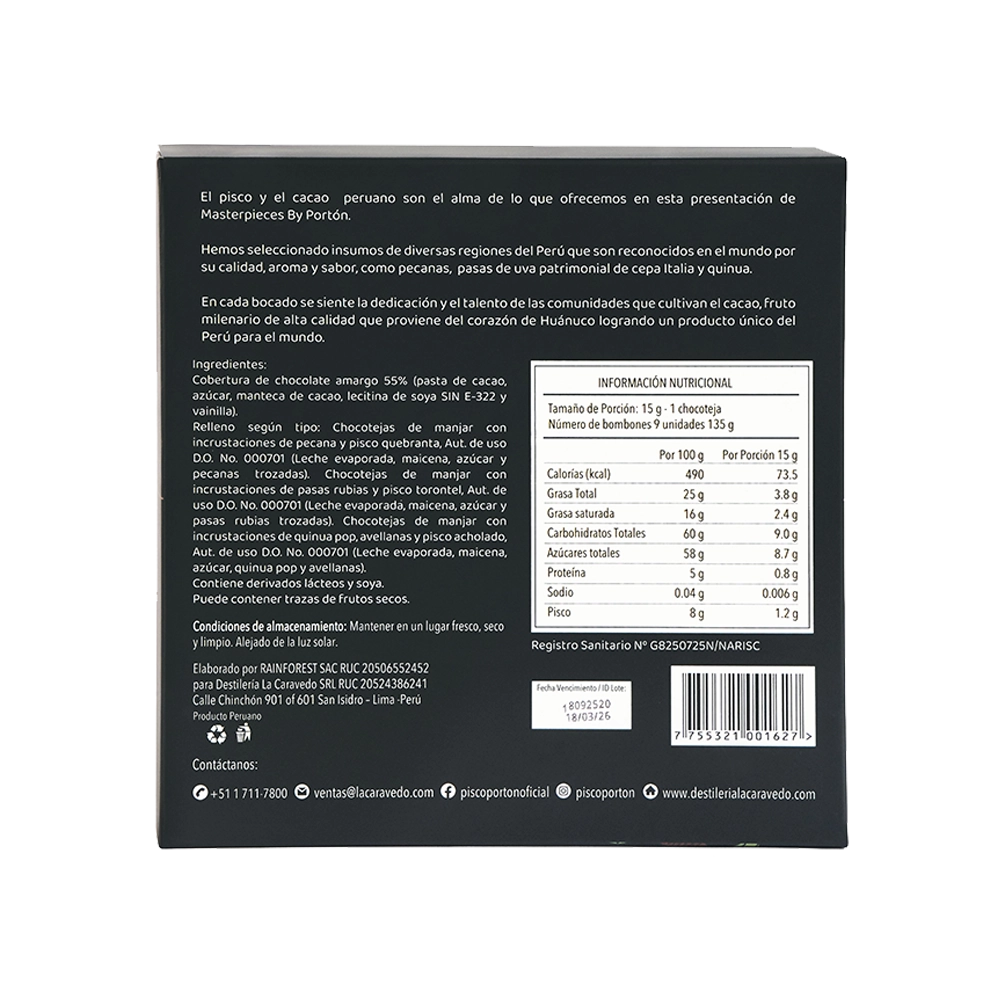 En cada bocado podrás sentir la dedicación del cultivo del cacao de alta calidad, proveniente del corazón de Huánuco, y el refinado pisco destilado en el distrito de Hacienda La Caravedo, en Ica.