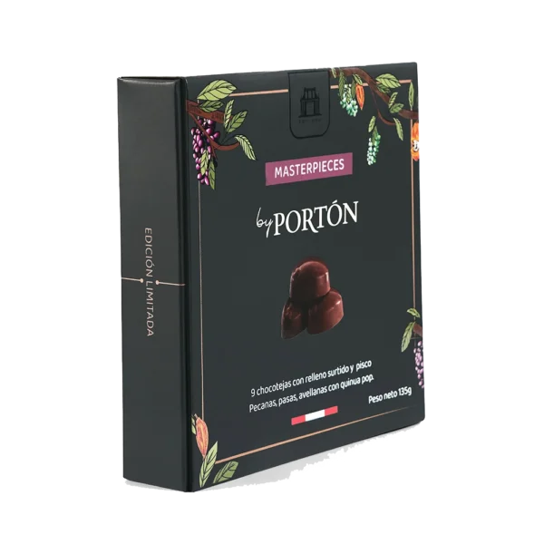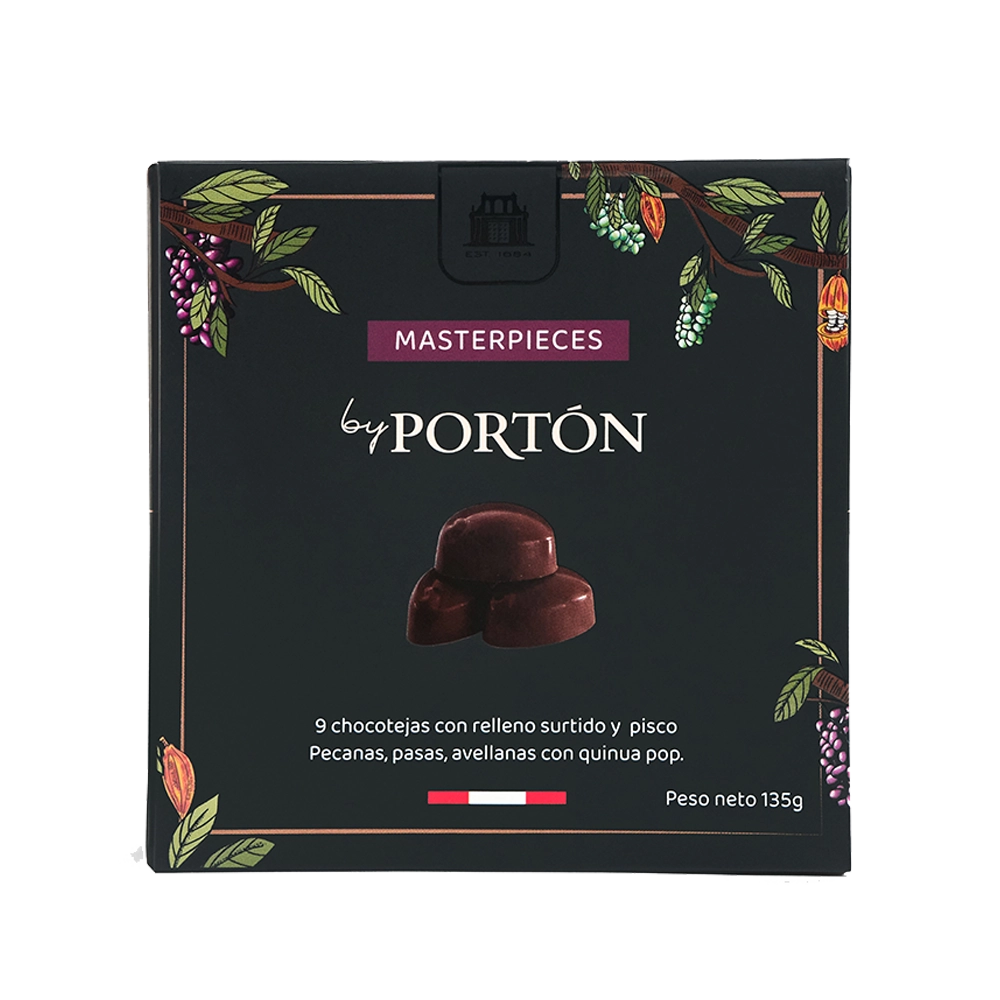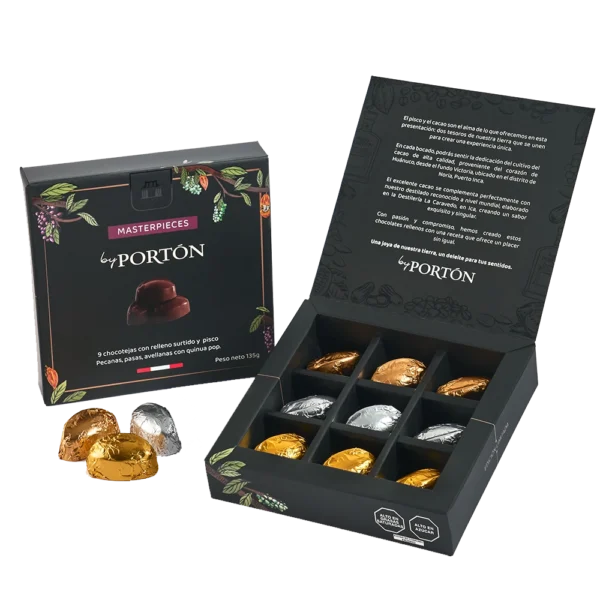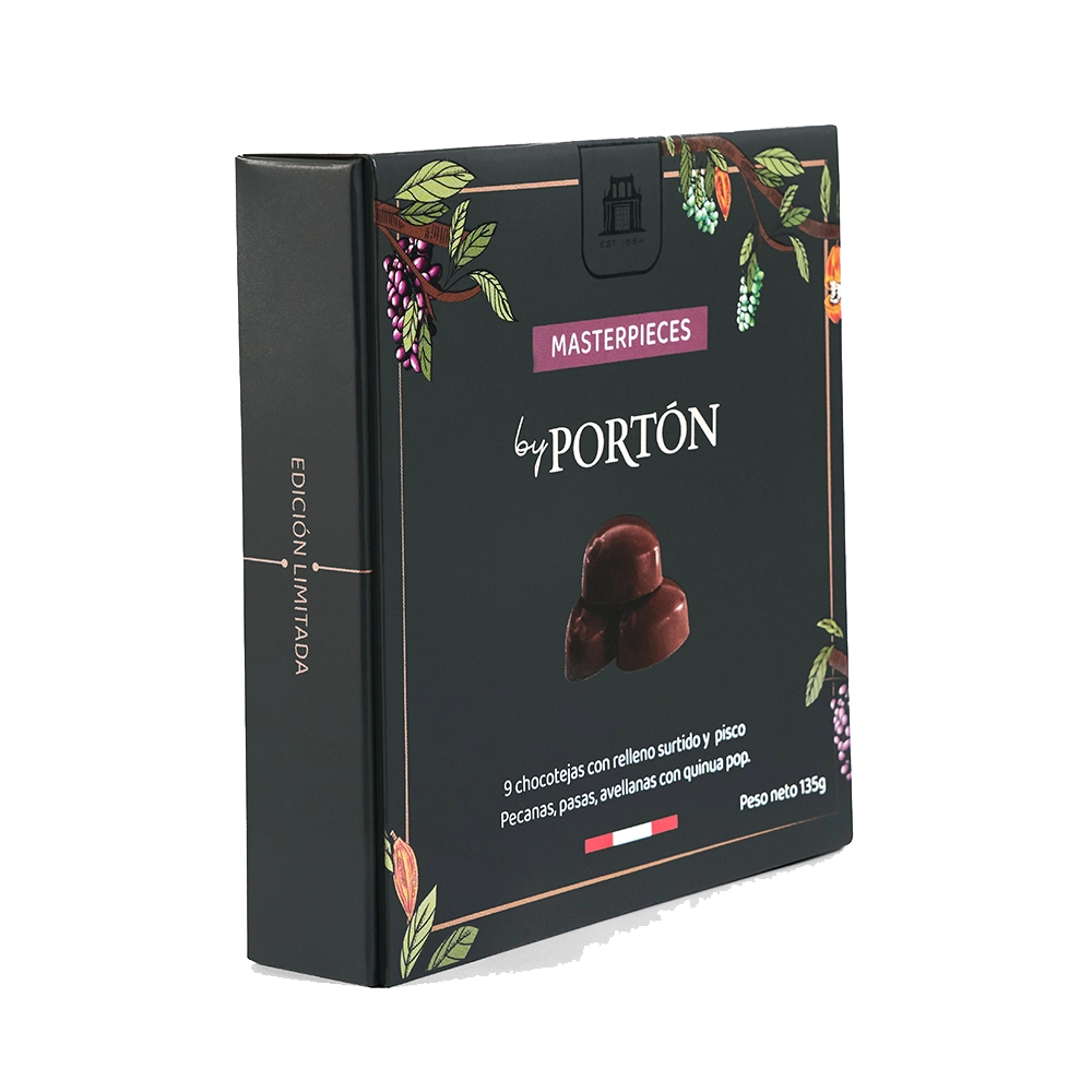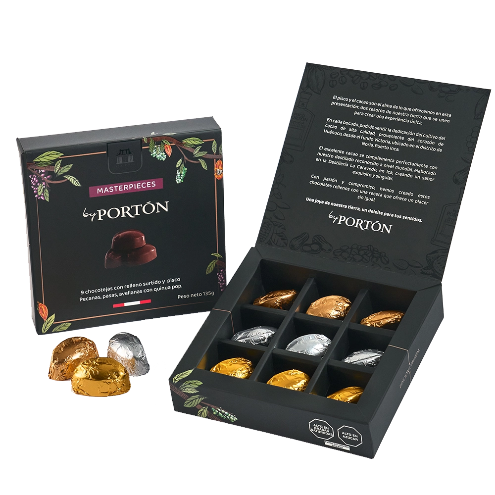 Chocotejas elaborados con cacao de Huánuco y Pisco Portón que se unen para crear una experiencia única, hechos con dedicación y arte peruano.